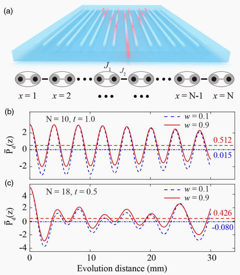 图 1 集成拓扑光子晶格、模型和模拟的示意图。(a)苏希杰模特素描。单位单元格标签x从系统边缘开始标记为1。每个晶胞由两个位点组成,每个位点都由激光写入波导实现。(b)、(c)模拟结果。当w=0.1和w=0.9时,PPDC的值分别在0和0.5附近振荡,分别对应于拓扑平凡相和非平凡相的系统。图右侧的数字表示PPDC的平均值。g的值设置为0.5。